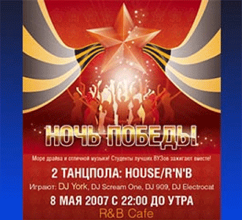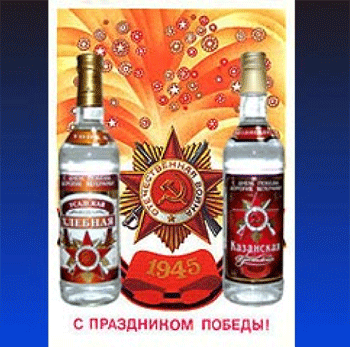 "Всеволожский" комбінат випускає горілку "Наша Победа", Петровський лікерогорілчаний завод випускав до недавнього часу горілку "Виват Победа", на етикетці якої зображені і ордени Великої Вітчизняної війни."Ошский" завод випускає горілку "С днем Победы", в Сибіру випускають горілку "Ветеран" (до речі з "георгіївською" стрічкою на етикетці). Компанія "Татспиртпром" до цього 9 травня продавала горілку з святковою "переможною" етикеткою з орденом Вітчизняної війни. Горілку під назвою "День Победы" в 2005 став випускати і білоруський "Малиновщизненский" спиртогорілчаний завод "Аквадив". Джерело: newsru.com, 10 травня 2007 Дивіться: