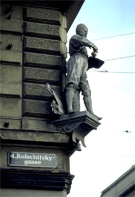За вивіску для шинку "Під синьою пляшкою" правив турецький кавник, який пізніше став знаком усіх кав’ярників. кав’ярня хутко стала славною для цілого Відня. Відвідувачі вчащали сюди не тільки через каву, але передусім, щоб побачити Кульчицького, який у віденців користувався великою популярністю. Часто можна було бачити в нього ґрафа Рідіґера Штаргемберґа і князя Євгена Савойського. Вабила гостей і його вродлива жінка Марія Урзуля. Згодом Кульчицький отримав від міста будівельну ділянку й дозвіл на будову кам'яниці, де міг би задовольнити всі потреби своїх гостей. Новий дім, що теж мав дерев'яні лави і столи, стояв біля мосту Шляґбріке (тепер Шведенбріке). Ця кав’ярня (нинішня адреса Відень: 2, Гойґассе 8) по смерті Кульчицького перейшла до рук його нащадків. Юрій Франц Кульчицький помер від сухот 19 лютого 1694 p., маючи ледве 54 роки. Кульчицький живе в пам'яті віденців до нинішнього дня передусім як патріярх віденських кав’ярників. Після смерти Кульчицького "професія" кав’ярників у Відні стала успішно розповсюджуватися. У 1700 р. було у Відні вже 4 кав’ярні, у 1748 р. - 11, а 1780 р. в самому тільки Леопольдштадті (тепер друга дільниця Відня) аж 6 кав’ярнень. А незабаром віденський стиль запозичають інші європейські столиці. Нині віденська кав’ярняна професія охоплює майже 1800 підприємств, що зорганізовані в так званій Фаховій групі кав’ярнень Відня у Віденській Торговельній Палаті. Вулиця на честь Кульчицького у Відні називається Кольшіцкіґассе, а на розі будинку Кольшіцкіґассе 2 і Фаворітенштрассе 64 колись була "Ґранд кав’ярня Цверіна ім. Кульчицького". У 1885 р. на тому розі на висоті першого поверху відкрито бронзову статую Юрія Кульчицького в турецькому одязі, який нагадує про його славний подвиг. У лівій руці він тримає тацю з філіжанками, а в правій кавник, з якого наливає каву у філіжанки. З правого й лівого боку ґзимсу, на якому стоїть статуя, видно турецькі воєнні хоругви і зброю. На обличчі Кульчицького типові козацькі вуса. Цей пам'ятник виконано в ливарні Герніка за проектом славного віденського скульптора Емануїла Пенделя. Хроніка кав’ярні розповідає, що ідея встановлення пам'ятника виникла влітку 1884 р. о 2-ій годині. Декілька постійних гостей, серед яких були переважно митці, завели мову про те, що ідеалізм поволі завмирає, і сьогодні люди думають тільки про свій шлунок, а за таких обставин мистецтво мусить загинути. На це власник Цверіна відказав, що він радо причастився б до чогось ідейного, але не знає, як. - Я вам дам відповідну пораду, - відповів скульптор Пендель. - Ось ваша кав’ярня лежить на вулиці Кульчицького, так? І цей для міста так надзвичайно заслужений чоловік, досі ще не має пам'ятника у Відні. Чому б вам, дорогий приятелю, це занедбання не виправити? - Так, маєте рацію, - погодився кав’ярник. - Кульчицький заслужив собі вповні, і я поставлю йому пам'ятник! - Найпростіший пам'ятник сьогодні коштує чималі гроші, - сказав скульптор Пендель. - Я знаю, - погодився Цверіна, - але якщо ви приймете виконання у ваші руки, то, може, він не буде аж таким коштовним. - О, задля такої нагоди я навіть відмовлюся від зарібку! А за кілька місяців уже відбулося урочисте відкриття пам'ятника Кульчицькому в присутності всіх віденських кав’ярників. Ліворуч від входу до "Ґранд кав’ярні Цверіна ім. Кульчицького" була ще чорна мармурова таблиця із таки