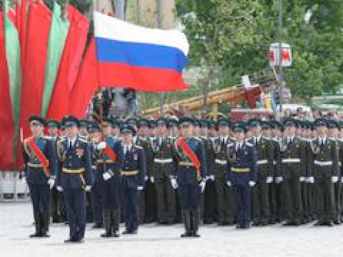У Києві червоний прапор пронесли вперед синьо-жовтого, а в Харкові парадом крокують російські військові