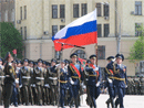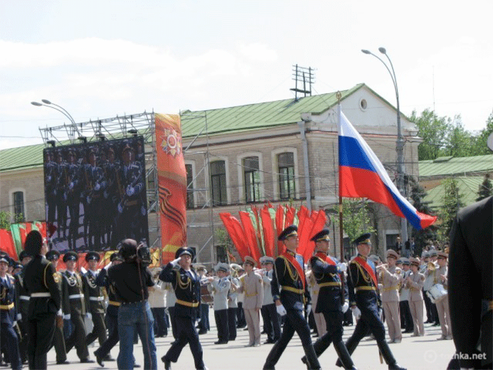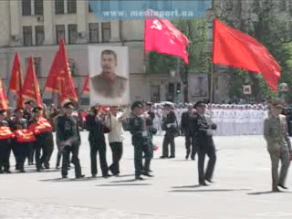Під час урочистої ходи Хрещатиком з нагоди вшанування 66-ї річниці Перемоги у Великій Вітчизняній війні прапор Перемоги несли попереду державного, синьо-жовтого прапора.