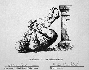 The Ig Nobel Prize, як і справжня Нобелівська премія, вручається у декількох номінаціях: медицина, фізика, біологія, хімія, література, економіка і премія миру. Крім того, антинобелівські премії в 2007 році вручили в категоріях "лінгвістика", "авіація" і "харчування". Премію за медицину одержали двоє британців, які дослідили наслідки для здоров'я проковтування меча. The Ig Nobel Prize з фізики присуджений ученим із США і Чилі, які знайшли наукове пояснення появі складок на одязі. Премії в області біології удостоєна доктор наук з Нідерландів, яка склала докладний перелік комах, грибків та інших представників живої природи, що мешкають у ліжках людей. The Ig Nobel Prize в номінації "економіка" присуджений тайваньському винахіднику, що запатентував пристрій, який, у разі спроби пограбування банку, ловить зловмисників у сіть. Літературну антинобелівську премію в 2007 році одержала мешканка Австралії за роботу, присвячену визначеному артиклю "the", в якій вона особливу увагу приділила складнощам, що виникають при спробі відсортувати в алфавітному порядку слова, які вживаються з цією частиною мови. За самі сумнівні досягнення в області хімії премія в 2007 році присуджена вченому із Японії, який розробив метод отримання з коров'ячого гною аромату із запахом ванілі. Премію миру оргкомітет The Ig Nobel Prize вручив співробітниками американського військового відомства за плани по створенню "секс-бомби", виділяючої при вибуху хімічну речовину, що провокує у військ супротивника напад гомосексуальної поведінки. У номінації "лінгвістика" перемогли вчені з Університету Барселони, які в ході експериментів встановили, що щури не розрізняють аудіозаписи голландською і японською мовами, якщо плівка прокручується навпаки. Антинобелівську премію у області харчування присудили жителю США, який провів дослідження меж людського апетиту, тестуючи добровольців за допомогою "нескінченної" тарілки супу, що самозаповнюється. У номінації "авіація" перемогли вчені з Університету Куїлмс в Аргентині, які встановили, що "віагра" дозволяє хом'якам краще відновлюватися після тривалих авіаперельотів. Ссылки по теме - 'Gay bomb' scoops Ig Nobel award - BBC News, 05.10.2007 http://news.bbc.co.uk/2/hi/science/nature/7026150.stm Джерело: lenta.ru, 03 жовтня 2007 Посилання на тему: - 'Gay bomb' scoops Ig Nobel award - BBC News, 05.10.2007 Висловити думку у Форумі Дивіться також: Евріка: Винайдено спосіб, як врятувати від спраги білих Мишей |
