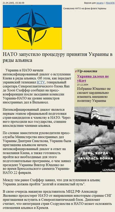 фашистського мессершмідта та написом „ДЕНЬ КОГДА НАЧАЛАСЬ ВОЙНА”, з гіперпосиланням на сторінку з жахаючим змістом та фотографіями. Через деякий час, на тому ж місці з’явився відомий плакат „ВЕЛИКАЯ ОТЕЧЕСТВЕННАЯ”, з посиланням на публікацію із не менш загрозливим змістом та страшними фотографіями. Далі, подібним же чином, з'явився плакат "НИ ШАГУ НАЗАД", з відповідними же гіперпосиланням та змістом.