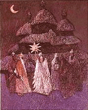 star_crictmas Надвечір село знову оживало - починалося масове колядування. У різних регіонах воно проводилося по різному: на Покутті колядували ще напередодні Різдва, на Лівобережжі - першого дня, а на Поділлі - водили ватаги лише другого дня свят. Готувалися до цього заздалегідь - виговляли колядницькі обладунки: восьмикутну зірку, маски Кози, Ведмедика. Різдвяні колядницькі гурти споряджали переважно парубки. Вони обирали отамана - хлопця, котрий вирізнявся спритністю, дотепністю і якого в селі поважали. Крім того він мав уміти гарно починати пісню, зробити в ній вивід. Традиційний одяг колядницьких ватаг - білі та коричневі кожушки й свитки, чоботи власної роботи, хустки або віночки у дівчат. Святкові ватаги залежно від регіону різнялися своїм кількісним складом і обрядовими персонажами. Обходячи оселі, колядники піснями та відтворенням побутових сценок поздоровляли господарів та іхніх дітей, бажаючи всім щастя й здоров"я на многії літа. Відомі класичні колядки "Нова радість стала", "Ой, новина в нас, новина".