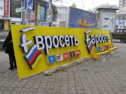 Прапори Росії розвішані по всій УкраїніНа це звертає увагу Всеукраїнське обєднання „Свобода”, що трактує рекламну кампанію російської фірми "Евросеть" як системний прояв окупації українського інформаційного простору з боку Російської Федерації.