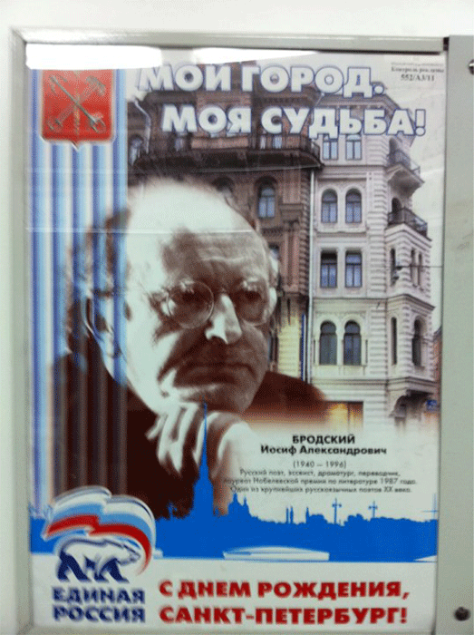 На вулицях Петербурга з'явилася серія агітаційних плакатів партії «ЄР». На них Пушкін, Ахматова, Бродський, Товстоногов, Ліхачьов, Цой та інші мешканці міста вітають північну столицю від імені партії. Як розповідають у блогах очевидці, напроти БДТ (Великий драматичний театр) з'явився портрет легендарного режисера Георгія Товстоногова. Поверх портрета - текст: «Мой город. Моя судьба. «Единая Россия». Як вважають петербурзькі діячі культури, партія навмисно використала в агітації покійних знаменитостей - від живих вони б згоди не отримали. Втім, не було отримано дозволу і від родичів знаменитих городян, зізналися у виконкомі «ЄР». На святково-партійних плакатах зображений герб міста, поздоровлення з днем СПБ, слогани «мой город, моя судьба», «Спасибо за Вашу радость», «Спасибо за Ваши улыбки, смех» «За Вашу работу», і вінчає все логотип «ЄР». У цій ситуації не дуже зрозуміло, хто вітає петербуржців зі святом - знамениті городяни, чиї портрети зображені на плакатах, партія влади або і ті, й інші разом, зауважує «GAZETA.spb». Ще залишається питання, коли лідер міських єдиноросів Вадім Тюльпанов встиг домовитися з Олександром Пушкіним привітати місто із днем його народження у 2011 році. Йосип Бродський навряд чи б схвалив розміщення свого портрета поруч з логотипом партії «Единая Россия» - про це в інтерв'ю радіостанції «Ехо Петербурга» заявив історик, публіцист, літератор і друг поета Яков Ґордін. Рідна донька Кірілла Лаврова не змогла відповісти на запитання радіостанції, підтримав би чи ні партію «ЄР» Кірілл Юрьєвіч. Як заявила Марія Лаврова, на її думку, розміщувати в такій ситуації плакати із зображенням людей, які вже не можуть особисто дати або не дати свою згоду, - це аморально: «Хочу сказати, що тато не належав до партії «Єдина Росія», і я не знаю, підтримував би він її зараз. Не мені про це судити, я не можу тут виносити своєї думки. Ну, а мого дозволу не питали і не питають. Я думаю, що я би не погодилася. Тут йде якась агітаційна робота з приводу виборів, я так розумію. І використовувати ім'я людини, яка вже не може сказати ні так, ні ні - я думаю, що це аморально », - зауважила Марія Лаврова, додавши, що не стане звертатися до суду за використання образу її батька в партійній рекламі. «Єдина Росія» не буде демонтувати плакати з Пушкіним, Цоєм і БродськимРодичі можуть обурюватися скільки завгодно Петербурзькі єдинороси не мають наміру демонтувати скандальні плакати партії «Єдина Росія» із зображенням портретів знаменитих городян, приурочені до дня міста, незважаючи на те, що представники партії заявили про готовність вибачитися за них. Про це заявила прес-секретар регіонального відділення єдиноросів Татьяна Камєнщікова, чиї слова передає ІА «Росбалт». Керівник фракції «ЄР» у Заксобранії Петербурга В'ячеслав Макаров, у свою чергу, заявив, що родичі відомих мешканців північної столиці, чиї зображення були розміщені на партійних плакатах, можуть обурюватися скільки завгодно. «Ми все зробили відповідно до закону про рекламу, і це не вимагає ніяких узгоджень і дозволів», - додав єдинорос. Однак, за словами Макарова, в партії готові піти назустріч незадоволеним родичам. «Безумовно, ті родичі, які визнали себе ображеними, ми з ними зустрінемось. Їх не так багато - з боку Ліхачьова і Лаврова. Порозуміємося з ними і принесемо свої вибачення », - повід