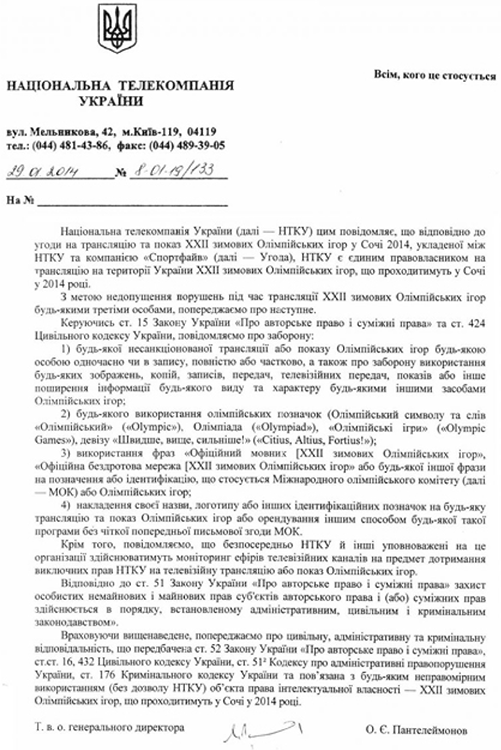 Тобто, викупивши права на трансляцію ігор, держканал ще дозволив собі те, що жоден власник приватного каналу, жоден олігарх не міг собі дозволити – заборонити українцям бодай згадувати про Олімпіаду.