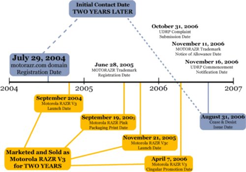Представник "Всесвітньої організації з захисту інтелектуальної власності" (WIPO), повідомив, що для позитивного вирішення у справі про захист авторських прав достатньо однієї публікації, в якій вказана торговельна марка. Навіть у тому випадку, якщо торговельна марка зареєстрована після публікації. Motorola не змогла надати WIPO доказів права власності на торговельну марку MotoRazr до офіційної реєстрації в 2005 році.