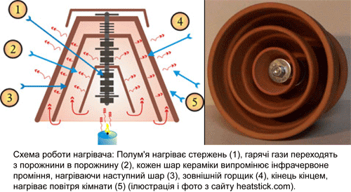Звичайна свічка, згораючи в приміщенні, тепла видає, як здається, зовсім небагато. А справа тут у тому, що гарячий її "вихлоп" просто йде вгору і швидко випаровується з вентиляцією. Тим часом, запасу енергії в свічці не так уже й мало. Більш того, з гарячим потоком продуктів згорання йде велика частина її енергетичного складу, і лише менша – переходить у світло. Лабіринтовий ковпак над полум'ям збирає енергію і дбайливо накопичує її, нагріваючись досить сильно (особливо розжарюється центральний стержень ). А потім це тепло поволі передається повітрю всією поверхнею керамічного радіатора.