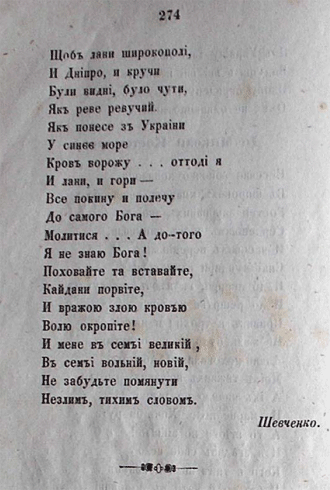 Николай, славившийся импровизациями, не стал ерепениться и сейчас же, под тот же мотив, запел, новую песню: "Ще не вмерлы Украины ни слава, ни воля, Ще нам братья молодые улыбнется доля. Развеются черны хмары и возле оконца, В украинской родной хате мы дождемся солнца. Вспомним злые времена, лихую годину, Тех, кто смело защитил Матерь- Украину Наливайко и Павлюк и Тарас Трясило Из могилы нас зовут на святое дило... "