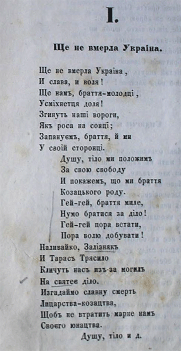 Кажется, песня была закончена. Правда, далеко ей было до Марсельезы, но звездные мгновенья такие же исключительные, как и сами звезды... Опять пошли воспоминания, запели „Соловья” Виктора Забилы, ”Журбу» (Грусть) Леонида Глебова. Но вот серб Пётр Ентич-Карич запел сербский Гимн, где припевом были слова: " Сердце бие и крев лие за нашу свободу"... -"Это же именно то, чего нам не хватало"- вскочил Павел Чубинский и запел бессмертные строки: Душу й тело мы положим за нашу свободу И покажем, что мы братья казацкого рода! Гей-о-гей же братья милы, пора браться нам за дило, Гей-о-гей, пора вставать, пора волю добывать! "