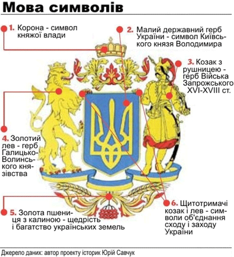 Герб включає зображення малого герба в центрі, тобто давно затвердженого тризубця, по сторонах від нього — фігури лева і запорізького козака, знизу — синьо-жовта стрічка, а зверху — княжа корона. Малий герб виконаний в кольорах національного прапора, а решта елементів — в жовто-червоних. «Проект був прийнятий за наслідками конкурсу на кращий ескіз великого Державного Герба України. Нас — п'ять співавторів: історики, художники, графіст. У своїй роботі ми керувалися гаслом, що герби не роблять і не вибирають — їх успадковують. Всі включені емблеми вже виконували в різні періоди історії України роль державних символів», — наводить «Сегодня» слова одного із авторів проекту, глави служби контролю за переміщенням культурних цінностей через держкордон історика Юрія Савчука. Художник Сергій Якутович зізнається, малювати ескіз було складно: «Робота дуже копітка. Потрібно промальовувати кожну риску, лінію і крапку. Доводилося кілька разів перемальовувати. Малювали ескіз 2,5 місяці. Зараз я вважаю, що вийшло дуже добре». Правда, у нового символу вже знайшлися супротивники. За словами екс-віце-прем'єра, нардепа і автора декількох книг з геральдики Дмитра Табачника, нинішній проект герба був затверджений без конкурсу і без публічного обговорення. «Великий герб повинен показувати історію виникнення земель і збирання їх навколо центру. Значить, наш Великий герб повинен виглядати інакше. У центрі повинен бути малий герб і герб столиці, а навколо — компонуватися герби історичних земель головних міст України. В даному випадку, виходить, що про символ Києва просто забули. Зате є герби Львова і Запоріжжя, які ніколи не були нашими столицями. Це просто провокація, причому історично безграмотна», — говорить Табачник. Втім, схвалення Кабміну ще не означає, що саме цей варіант герба одержить Україна. Тепер проект буде направлений на розгляд Верховної Ради — за його ухвалення повинні проголосувати дві третини депутатів. ЗА КОНСТИТУЦІЄЮ Озброєний козак і тризубець в проекті Великого герба — вимога Конституції. Згідно ст. 20 Основного закону, головним елементом великого Державного Герба України повинен бути Знак Княжої Держави Володимира Великого (малий герб) з урахуванням герба Війська Запорізького, яким є зображення козака з мушкетом. 17 липня 2009 Споріднені публікації: