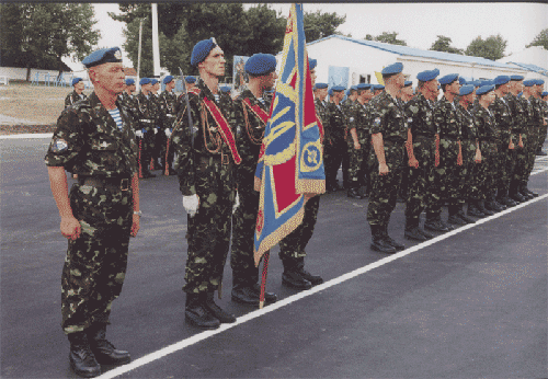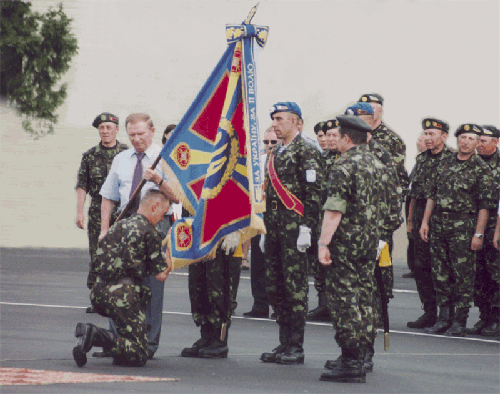 Президент України Л.Д.Кучма в урочистiй обстановцi вручав 25-й Окремiй Повiтряно-десантнiй бригадi вiйськовий прапор, виконаний Творчою Майстернею.