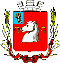 The soviet emblem It was confirmed at September, 18th, 1985 by the decision N3-19/3 of III city council session of XIX convocation. The board per fess by azure and gules. In the shield is argent horseman on the argent horse, holding in lifted hands the or sheaf of ears. Under the horseman are three or waves. In the chief of or cartouche is the sable city name in the Ukrainian language, in its base is sickle and hammer. A horse is element of the historical arms, a symbol of steppe open spaces and cossacks. The horseman means city image, because it is youngest regional center of republic. The authors are N.Telizhenko, A.Petrenko, A.Kostogryz.