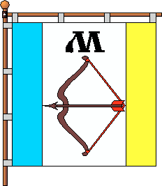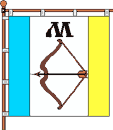 The gonfalon The gonfalon is a rectangular canvas with a ratio of the sides 1:1. In the white field is a strained brown bow with gules bow-string, turned to the right, with brown arrow over it in an argent field. There is black letter "M" above the bow. In left and right the gonfalon has a blue and yellow edging. ![]() |