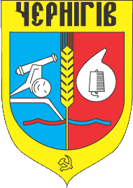 It was confirmed at March, 15th, 1969 by decision I of city council session of XII convocation. Board per pale by azure and gules. In the center of it is the or ear in pale. In the right part is argent ancient gun to the left. In the left field are argent retort and sheave on it. In the base is per pale fillet engrailed fess countercharged with fields. In the chief or cartouche is the sable city name in the Ukrainian language, in its base are sickle and hammer. Ear is symbol of the center of agricultural region. The gun is symbol of a fortress. A retort and sheave symbolize the basic directions of the industry - manufacture of synthetic fibres and cloth combine. Waves symbolize the Desna river. The author is A.Lemeshko.