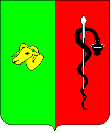 The emblem of the Russian period was confirmed on the 17th of November 1844. A shield was per pale with vert and gules. In the right field there was an or ram's head to signify good conditions for breeding of grey sheep. On the left a sable dragon entwined round an argent staff and drinking from a sable cup - the symbol of Medicine - to signify Saksky mud. The effect of the mud - cure is undoubted.