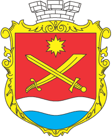It was confirmed at 2000. The shiels per fess by the argent abaised wavy fess on a gules field and an azure base. In the first field are crossed yatahgan and a sword, above it is or twelve-bows star. The author is Yu.Brovchenko. The star is a symbol of purposefulness and attentiveness, a reference point of a just way, a pledge of heavenly protection, spiritual and material revival, the declaration of a humane public choice. The crossed yatahgan and sword is the symbol of an opposition of death, a mention of struggle of the Ukrainian cossacks with the Tatar and turkish enslavers which occured on these lands. The argent wavy strip symbolizes Mala Vyska river on which banks was the settlement which now became city. V.Kryvenko, K.Shlahovyi, "THE KIROVOHRADS'KA OBLAST' SYMBOLS"