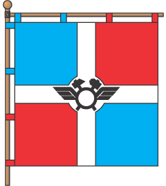 It was confirmed at December, 20, 2002. The shield is divided by argent fillet cross. In the first and fourth parts are vert apple branches with two gules apples. In the second and third parts are argent paty cross. In the center of fillet cross is railway emblem. The emblem adorned by or decorative cartouche and crowned by gules mauerkrone with three embattlements. The author is A.Avdeev.