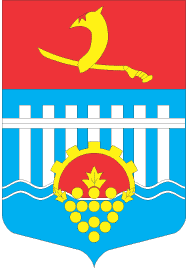 It was confirmed at 26.06.1968 by the decision N206 of city council executive committees. The board per fess by gules and azure. In the top part is or military cap with a sabre. In the bottom is the stylized image of hydroelectric power station as argent fillet fess and seven argent fillet pales. On it is half or gear with a or branch of a grapes. Under pales are two argent wavy fillet fess. The author is J.Ravich. ![]() |