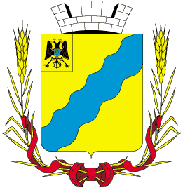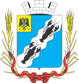 In an azure field is argent wavy bend sinister with two sable cancers. In the canton is an emblem of Tavrijs'ka province. The shield is crowned with an argent mauerkrone with three embattlements and within two or spikes entwined with the ribbon of the Order of St.Olexander. The emblem was not approved.