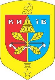 The soviet emblem It was confirmed at August, 22nd, 1969 by the decision of city council executive committee. The shield per pale by gules and azure. In the shield are or stylized branch of a chestnut and the argent bow accompanied by the argent city name in the Ukrainian language. In the chief of or cartouche are sickle and hammer, in its base is the Gold Star of the city-hero. The authors are F.Yyriev, B.Dovgan'.