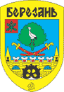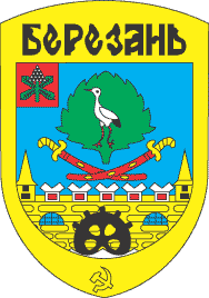 The soviet emblem It was confirmed at September, 9th, 1990 by city council. In an azure field with the wavy base is an or fortification with two windows and gules with argent merlons. On a wall's background is a sable mill wheel. Above the wall is a vert leaf of birch with a stork above two or sabres in gules sheathes. In a canton is blossoming branch of a chestnut of natural color in a gules field. In the chief or cartouche is the city name in the Ukrainian language, in it base are sickle and hammer. Two sabres symbolize Berezans'ka squadron in B.Khmel'nyts'kyi, and also show, that the city was found in birchwoods on a place of a security cossack post. Fortification with a wheel is a fragment of a small town of rest and entertainments, one of the best in area. Wheel is a symbol of the industry. The author is B.Shulevs'kyi. ![]() |