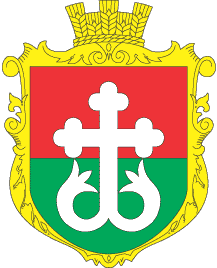 The shield per fess by gules and vert. In the shield is argent blossomed clower cross. The emblem adorned by or decorative cartouche and crowned by an or rural crown. According to legends, the village was found by Kyiv monks, there was monastery hospital here, and the significant part of the population was cossacks. Therefore an emblem of village became a cross which means corporal death and revival for eternal paradise life in christian symbolics. The trident of clower is a symbol of the Sacred Trinity and a symbol of threefold life - bodies, souls and spirit. Association of gules and vert colors is an association heaven and terrestrial.