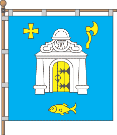 Gonfalon is a rectangular dark blue panel, in which are white cellar with the yellow door, accompanied in a right top corner by the yellow paty cross, the left top corner by the yellow axe, and by the yellow fish below. ![]() |