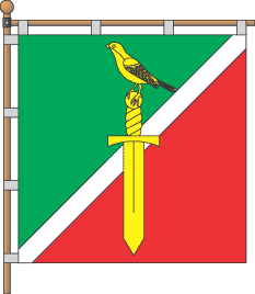 Gonfalon is the rectangular panel divided by a narrow diagonal white strip from a free corner on red and green fields. In the centre is a yellow sword in pale on which sits the yellow nightingale. ![]() |
