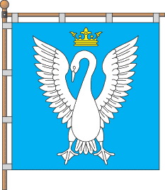 Gonfalon is a rectangular dark blue panel. In the centre is a white swan with the straightened wings, topped by the yellow crown. ![]() |
