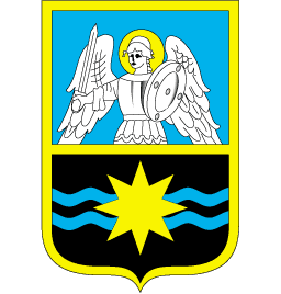 The shield per fess by azure and sable. In the upper part is archangel Michael with raised sword. In the bottom part is or eight-radial star, placed to the wave azure belts. Sable means memory about Chornobyl' tragedy, azure means hope for the light future. An or star is attempt to find a character of atomic engineering instead of "models of atom ". Eight its rays mean eight republics, which one have shared in building city.
