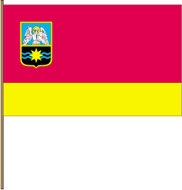 The flag is rectangular with the size 160 cm in horizontal direction and 100 cm in vertical direction. On a flag's field in the left-hand upper corner apart 15 cm from above and 15 cm at the left is the emblem of the city that has width 29 cm and altitude 36 cm. The flag's field is divided into two parts. Upper has 70 sm and crimson colour, lower part is yellow and has 30 sm. ![]() |