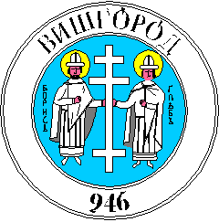 The basis of the emblem of the town is a traditional picture of saints Boris and Glib in specific mackintoshes and in high princes' hats. To the icon graphic picture over the saints the word "Vyshhorod" and the year of foundation of the town (946) are added. The emblem is created by the archaeologist R.S.Orlov in 1994 on the basis of an amulet of XIII - XIV centuries.