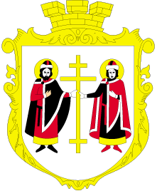 The modern emblem was approved by the solution є144 of city council convocation at March 3, 1996. In an argent field are gules-sable clothed sacred Borys and Glib wich hold or cross. Sacred Borys and Glib symbolize outstanding historical city past as a large craft center and northern outpost of Kyiv, and also one of oldest churches built in the city. The or cross historically symbolizes city as one of most ancient centers of religious life of Kyivs'ka Rus' and availability an ancient monastery near the city. The gules widely common during Kyivs'ka Rus' and means bravery and force, boldness, love. Sable means guard, wisdom, depth and mystery of life, grief. The affiliation gules and sable symbolically transmits tragedy of Borys and Glib who was killed by brother from approve idea of christian love. The argent symbolizes purity, faultlessness and uprightness.