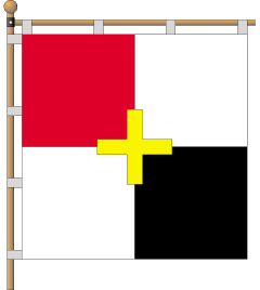 The gonfalon was approved by the solution N144 of city council convocation at March 3, 1996. It is a rectangular canvas with a ratio of the sides as 1:1 (size of a panel pursuant to the measurement standard 100х100sm). In the center of the gonfalon is an or cross, the size makes which one 1/3 values of a panel. The cross partitions a panel on four isometric parts. A upper-left-hand part (from the spectator) - red, lower right - black, and two other - white colours. The facing and return parties are identical.
