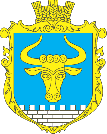 In an azure field with argent gear base is or head of the bull. The emblem adorned by or decorative cartouche and crowned by an or rural crown. The argent wall symbolizes defensive value of strengthening at the Kyivs'ka Rus' times. An or bull head means ancient wild bulls which were found once to Polissya and have finally disappeared at XVII century. In national poetry bull is a symbol of a gigantic force and bravery.