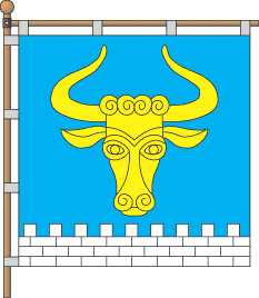 Gonfalon is a dark blue rectangular panel with a white gear basis. In the centre is a yellow bull head. ![]() |