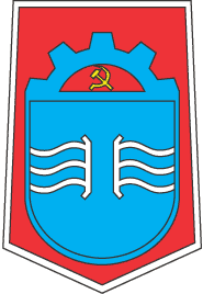 Затверджений 30.07.1971р. рішенням N344 виконавчого комітету міської ради. У п'ятикутному червоному щиті - лазуровий щиток, увінчаний половиною шестірні, у якому три розімкнутих хвилястих нитяні пояси. У половині шестірні - золоті серп і молот. Пояси означають ріку Дніпро, яку перетинає міст у топографічному зображенні. Герб має вузьку сріблисту облямівку. Автор - Л. Сидоренко.