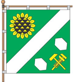 It is a square green panel with white strip from bottom flagstaff corner to upper free corner. In the upper part is yellow-black sunflower, in the bottom are yellow crossed hammer with a raiway key in cross, accompanied by two white hexagons. ![]() |