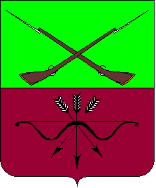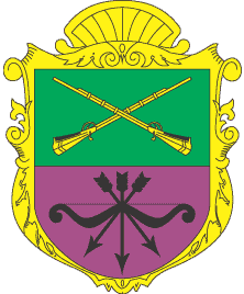 The emblem of the Russian period was confirmed on the 29th of July 1811. In the upper part of a per fess with vert and purple shield two rifles were put crosswise. In the lower part there was a sable bow with three arrows turned down which symbolized the might of our arms and the weakness of the Tartars.