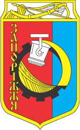 It was confirmed at October, 5th, 1967 by the decision є488 of city council executive committees. Board per pale as 2:1 by gules and azure. In the circle formed by or metal, flowing from the argent ladle, and half sable gear, is or contour of Dnipro hydroelectric power station. In the right part of a shield is or city name in fess. In the argent chief are the cossack sabre, a bandura and horse-tail, that mean famous pages of the Zaporizhzhya cossacks. The author is V.Storozhuk.
