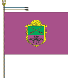 The shield per fess by vert and crimson. In the first part are two crossed cossack muskets. In the second part is sable bow with three arrows down. The shield is edged by or cartouche and crowned by or Dniproges electric power station.